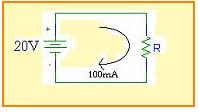 Del circuito se puede definir: E = 20 V, I = 100 mA = 0.1 A. Aplicando las fórmulas: