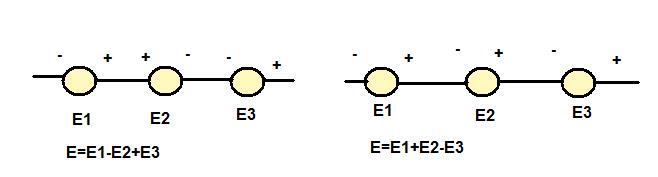 Las fuentes de voltaje se conectan en serie y su valor final depende de la suma algebraica. Por ejemplo: