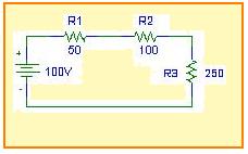 Resistencia equivalente del circuito serie:Req = R1 + R2 + R3Req = 50 + 100 + 250 = 400ΩPor Ley de Ohm, I = E / R, V = R* II = E/R = 100 V / 400 ohm = 0.25 A.V1 = R1 * I = 50 ohm * 0.25 A = 12.5 VV2 = R2 * I = 100 ohm * 0,25 A = 25 VV3 = R3* I = 250 ohm * 0,25 A = 62,5 VPrimera Ley de Kirchhoff: