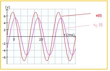 La señal de voltaje en el condensador está atrasada (comienza después) con respecto a la de la fuente, esto es, que tiene fase negativa, como se aprecia en la figura: