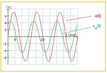 Observe las señales de la fuente y del voltaje en la resistencia. Al igual que la corriente, la señal de voltaje en la resistencia tiene fase positiva (comienza primero) con respecto a la de la fuente.