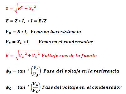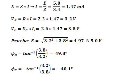 Para los valores dados y teniendo en cuenta que los voltajes en la resistencia y en el condensador está desafasados 90 grados, se tiene: