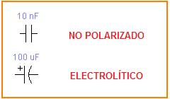 Los condensadores de capacitancia pequeña no tienen polaridad y los capacitancia grande son polarizados y se denominan electrolíticos. Se representan simbólicamente de la siguiente manera: