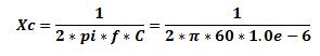 2 * pi * 60 * 1.0 Exp 6 +/- = 1/x = respuesta Xc = 2652 ohm = 2.6 Kohm