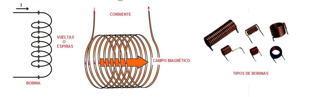 La bobina es un elemento eléctrico que tiene como fin almacenar en su interior un campo magnético al pasar una corriente por el. Está formado por un alambre enrollado conocidas como vueltas o espiras. Se mide por su inductancia (L) y este valor depende de la forma geométrica, esto es, de su longitud y de su diámetro. su sección transversal puede ser cilíndrica o rectangular. En su interior puede tener un núcleo generalmente de hierro laminado con el fin de darle mayor valor a su inductancia.
