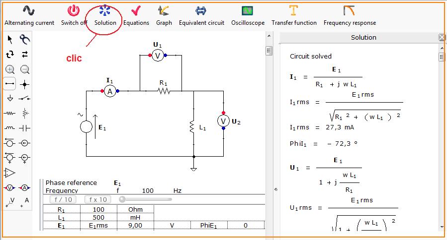 (a) Ejecute el programa simulador Solve elec y simule el circuito RL de la figura. Corra el programa para obtener la corriente, voltajes y fases. Compruebe teóricamente. E = 9.0 V, f = 100 HZ, R = 100 ohm, L = 500 mH,