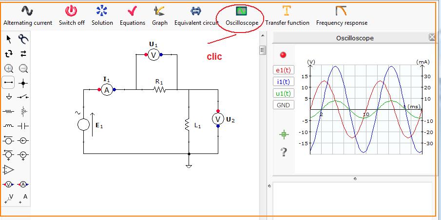 (b) Obtenga las señales de corriente y voltajes con la opción Oscilloscope.