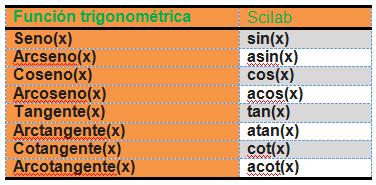 Scilab puede calcular las funciones trigonométricas seno, coseno, tangente, cotangente. El ángulo debe darse en radianes, por lo tanto si el ángulo se da en grados debe convertirse en radianes usando la fórmula:
