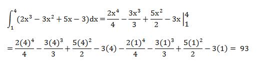 Hallar la integral de la función y = 2x3 - 3x2 + 5x - 3 entre x=1 y x=4